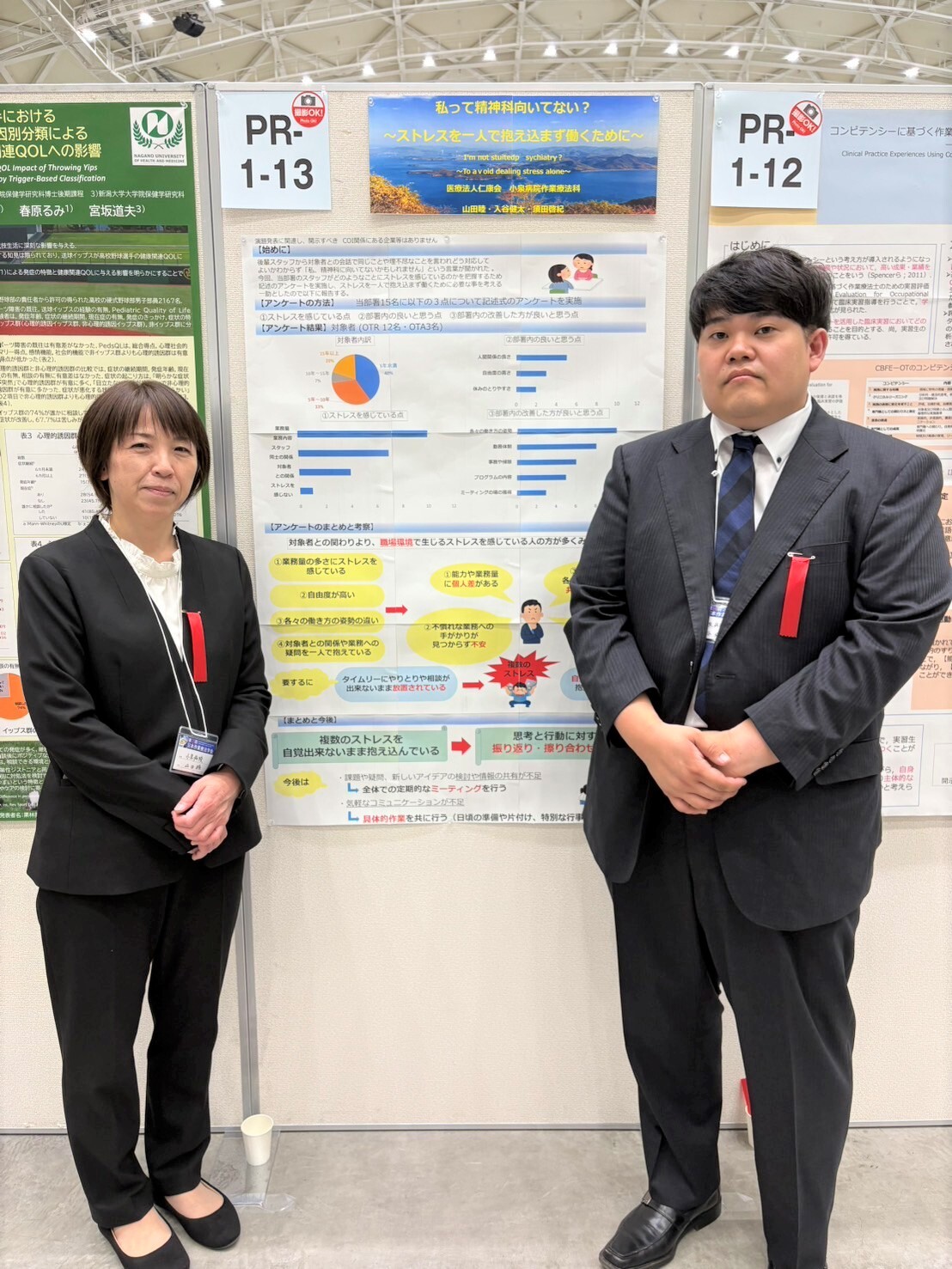 当院からは、山田作業療法士・入谷作業療法士の2名が参加し、『私って精神科向いてない? ~ストレスを一人で抱え込まず働くために~ 』というタイトルでポスター発表を行いました。