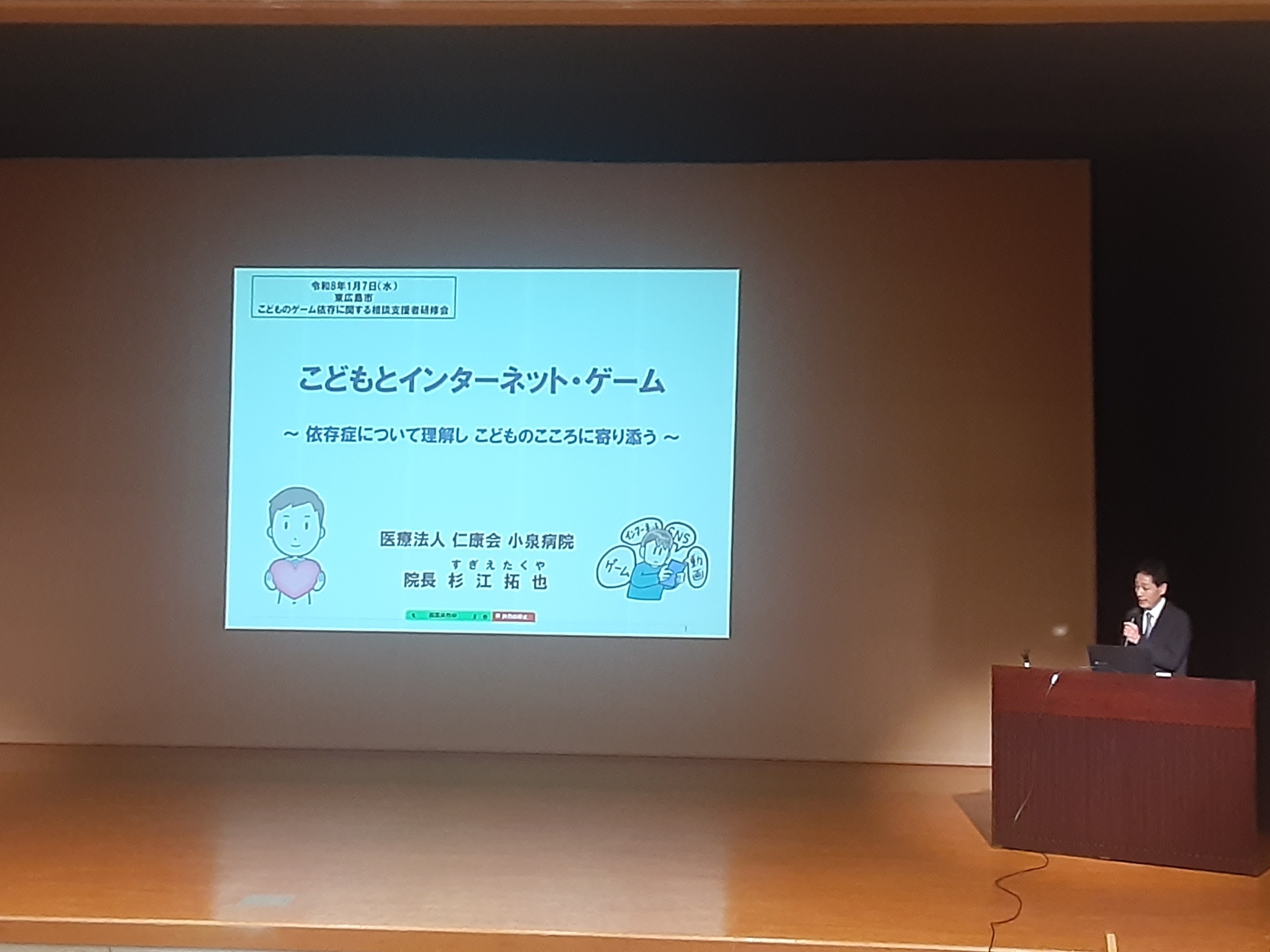 令和8年1月7日(水)東広島市市民文化センターにて、『こどものゲーム依存に関する支援者研修会』が行われました。そこで講師として、当院杉江病院長が「こどもとインターネット・ゲーム ~依存症について理解し こどものこころに寄り添う~ 」というテーマで東広島市でこどもの支援に係る職員様や関係者の方々を対象に講演会を行いました!今後もこのような活動を積極的に行って参ります。気になる方がいらっしゃいましたら、お気軽に当院までお問い合わせください。