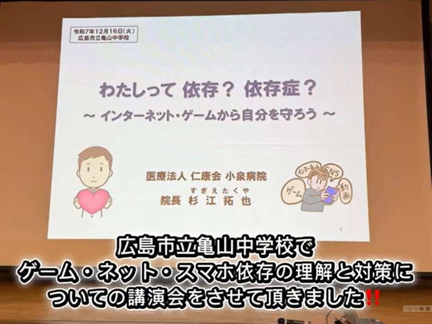 令和7年12月16日、広島市安佐北区にある亀山中学校へ訪問し、「ネット・ゲーム依存」の講演会を行った様子を短編動画にまとめました!