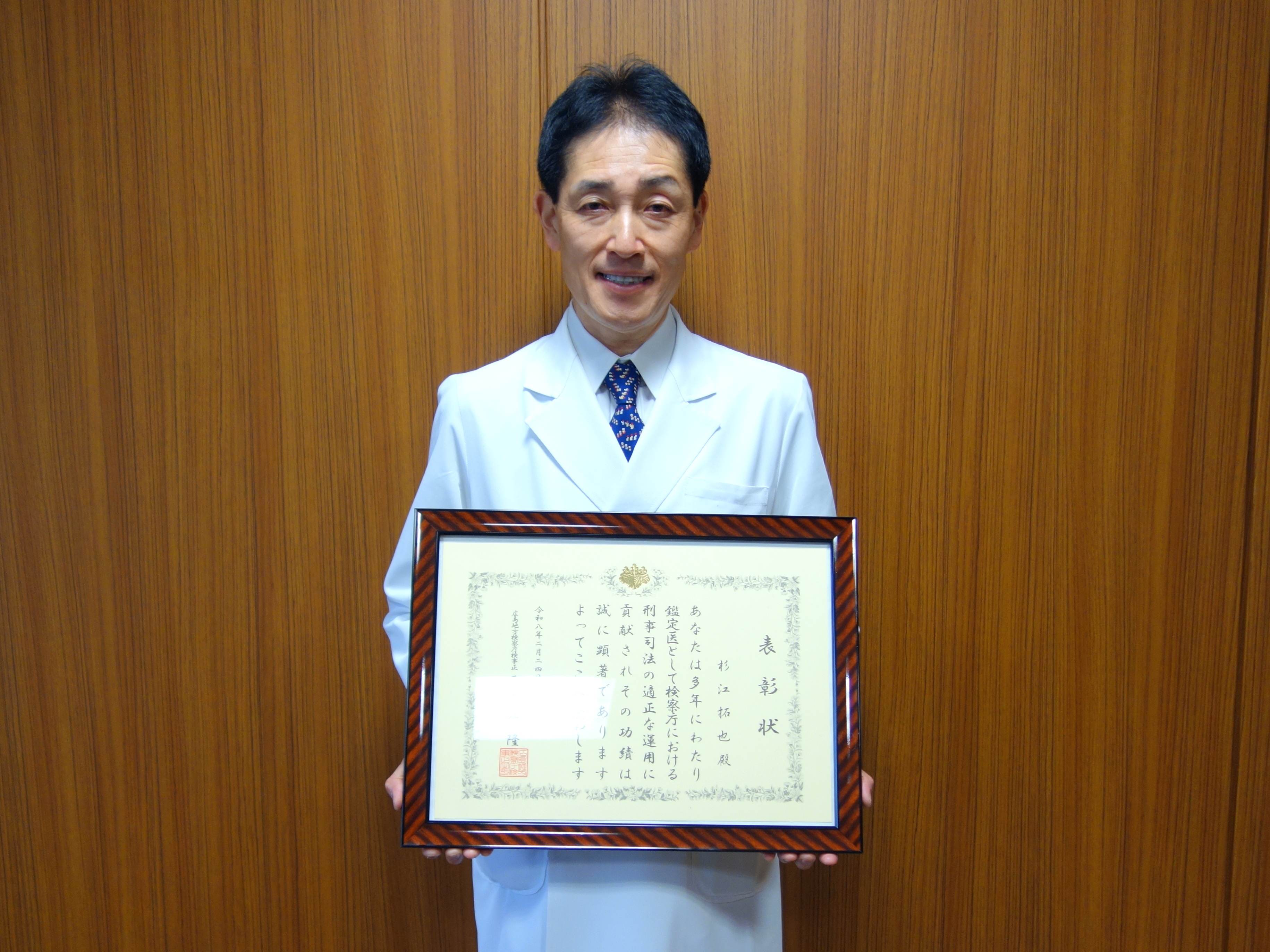 令和8年2月24日(火)当院杉江拓也病院長が広島地方検察庁検事正より鑑定医の業務において刑事司法の適正な運用に貢献したとして表彰されました。